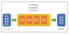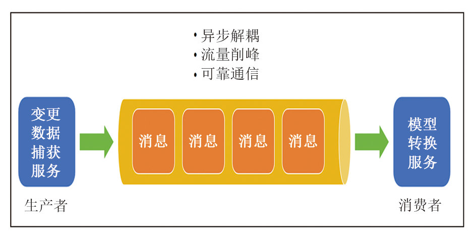 考虑到源数据库会出现数据高频次、大批量发生变更的情况, 此时如果直接将通知转发给模型转换服务, 可能会触及下游服务在数据处理方面的性能瓶颈而导致任务积压, 进而发生Java运行内存激增、堆栈溢出等异常情况, 严重影响服务运行的稳定性。为了避免上述问题的发生, 需要将变更数据捕获服务对模型转换服务的同步调用改为异步调用, 降低服务之间的强依赖, 增加系统的韧性[6]。因此, 在两服务之间加入消息队列充当消息传递的载体, 变更数据捕获服务产生的消息进入消息队列中排队, 模型转换服务根据实际处理能力, 依序从消息队列中消费消息, 如图2所示。结合消息队列的数据持久化、自动重试和消费确认等机制, 不但能实现服务之间的异步解耦, 还具备流量削峰、可靠通信等优势。