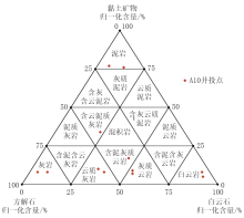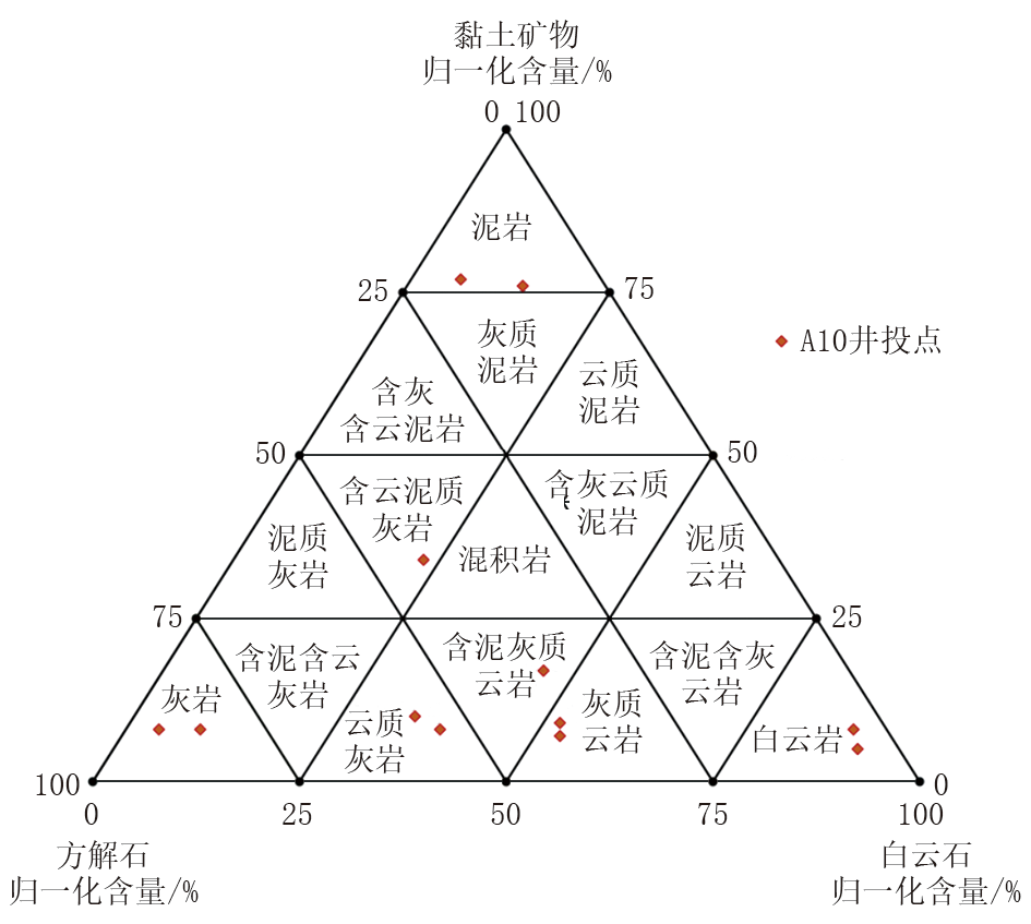 以A 10井为例, 利用岩性定名三角图板对12个样品进行投点(图1), 投点结果与薄片鉴定定名对比符合率达100%。如表1所示, 该井揭示了包括灰岩(方解石归一化含量82.37%~87.32%)、云岩(白云石归一化含量88.05%~90.13%)、泥岩(黏土矿物归一化含量76.43%~76.70%)以及云质灰岩、灰质云岩等多种过渡岩性在内的完整岩性序列。三角图板精准刻画了从灰岩端元到云岩端元的连续矿物演化, 为实钻地质剖面的精确构建提供了可靠依据。
