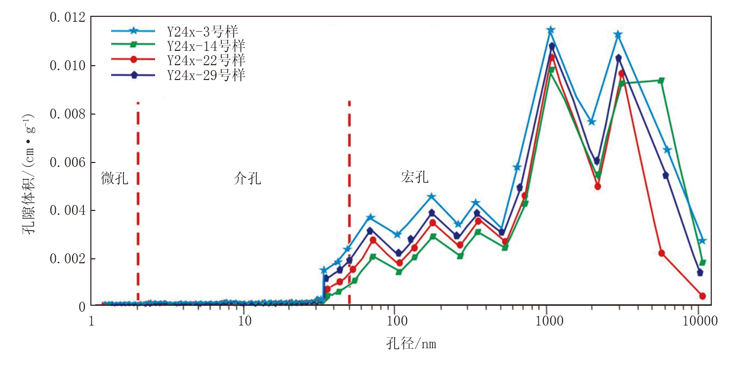 CO2吸附实验主要用于测量孔径< 2 nm的微孔孔隙结构。从图8a可以看出, Y 24x-14号样与另外3块样品吸附曲线有明显差异, 但4块样品的吸附曲线趋势基本一致, 整体上样品的吸附量较少, 低于0.07 cm3/g。通过样品孔径分布曲线(图8b)分析可见, 4块样品的分布曲线波峰出现位置不同, 其中Y 24x-3、Y 24x-14及Y 24x-22号样的孔径分布曲线出现单峰, 波峰出现的位置分别在0.55、1.05、0.75 nm左右, Y 24x-29号样出现双峰, 波峰位置在0.65、0.85 nm左右。4块样品中Y 24x-14号样的微孔占比较其他3块样品的稍大, 但整体上4块样品的微孔对总孔贡献率较低, 微孔发育较差。通过4块样品的累计吸附分布曲线(图8c)分析可见, Y 24x-3号样在孔径0.5 nm附近快速增长, 在0.6~1.0 nm出现平台, 说明微孔孔隙占比较少, Y 24x-22及Y 24x-29号样前期缓慢增长, 在孔径0.8 nm附近快速增长并进入平台, 而后在1 nm附近又呈现上升趋势, 说明储层中孔径< 1 nm的孔隙不发育, Y 24x-14号样仅在孔径1 nm后急剧上升, 曲线斜率较大, 也同样说明储层微孔占整体孔隙体积较少, 显示微孔欠发育。