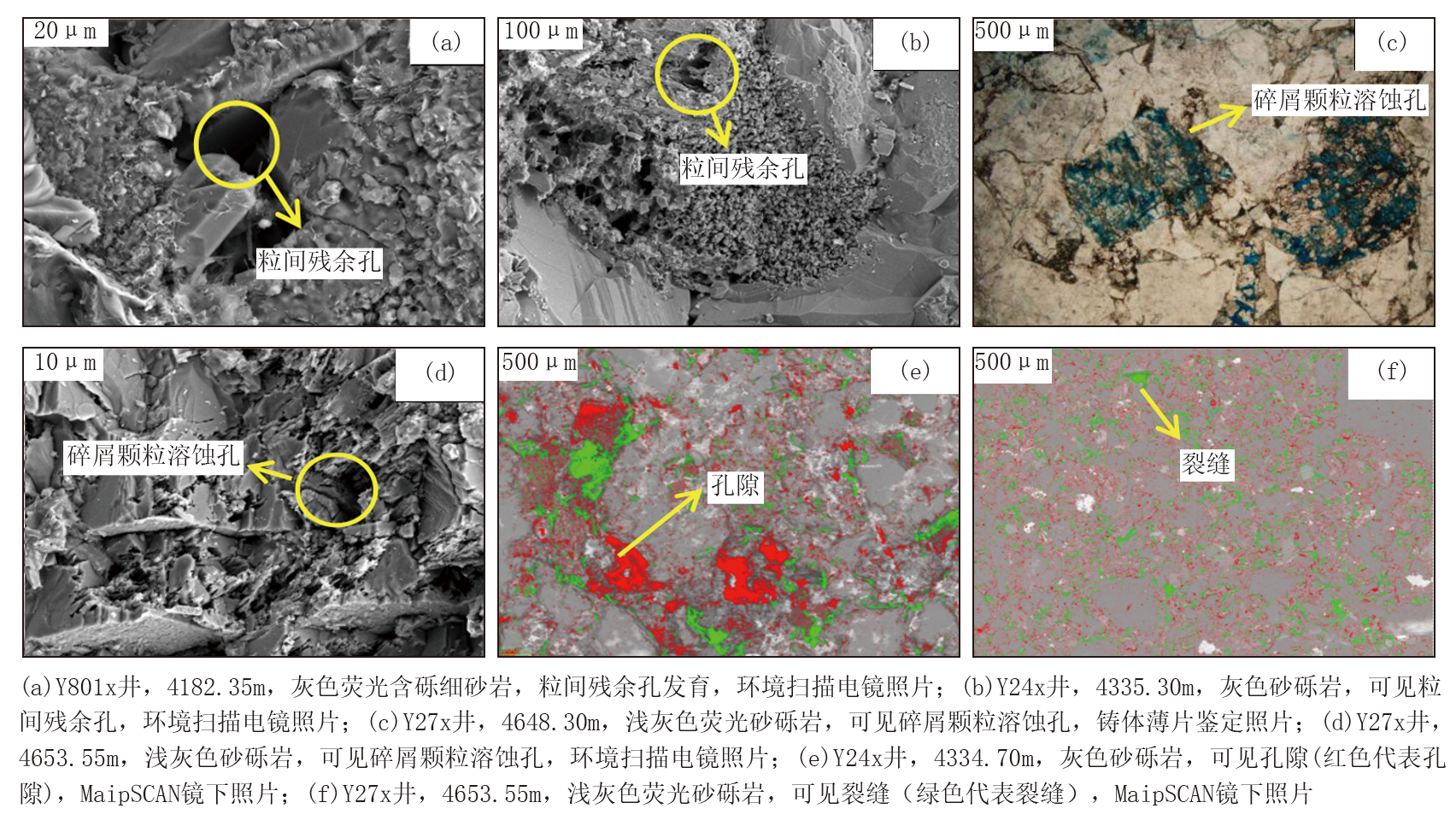 研究区发育大量的粒间残余孔及碎屑颗粒溶蚀孔, 从样品铸体薄片鉴定、环境扫描电镜照片中可清楚地观察到砂岩中的粒间残余孔, 以及岩屑碎屑、黏土杂基经不同程度溶蚀形成的碎屑颗粒溶蚀孔(图3a-图3d), 直至完全溶蚀形成铸模孔; 孔隙半径平均值7.10 μ m, 面孔率平均值6.50%。个别样品发育有颗粒裂缝, MaipSCAN镜下观察可见储层微观上孔隙、裂缝发育(图3e、图3f), 连通性较好。整体研究表明, 研究区储层储集空间遭后期改造居多, 这也使得储集空间得到一定程度上的增大。