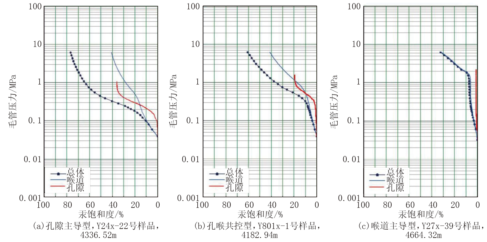 选取研究区3口井流二段储层10块岩心样品进行恒速压汞实验, 根据恒速压汞曲线特征(图5)和实验数据(表2)分析得出, 研究区流二段储层孔喉类型有孔隙主导型、孔喉共控型和喉道主导型。孔隙主导型的样品, 进汞主要受控于孔隙, 总体毛管压力曲线与孔隙毛管压力曲线趋势保持一致, 喉道毛管压力曲线在早期直线上升, 中期略趋于平稳而后迅速上翘(图5a); 该类样品排驱压力较小, 为0.242 MPa, 最大连通喉道半径较大, 为3.534 μ m, 总孔隙体积与喉道体积比最大, 为1.460, 说明储层中孔隙发育并占主导地位。孔喉共控型的样品, 在进汞初期总体毛管压力曲线与孔隙毛管压力曲线趋势保持一致, 说明汞先进入大孔隙中, 而后孔隙毛管压力曲线上升, 总体毛管压力曲线和喉道毛管压力曲线趋势保持一致, 说明汞随后进入小喉道中, 导致最后孔隙与喉道的进汞饱和度相近(图5b); 其平均喉道半径介于0.942~3.083 μ m, 最大连通喉道半径介于1.317~3.037 μ m, 喉道分选系数均大于1.300, 总孔隙体积与喉道体积比介于0.473~0.881, 说明储层中孔隙与喉道分布均匀。喉道主导型的样品, 在进汞初期, 总体毛管压力曲线与喉道毛管压力曲线趋势保持一致, 最终喉道进汞饱和度远高于孔隙进汞饱和度(图5c); 该类样品排驱压力较高, 介于0.475~1.291 MPa, 平均0.807 MPa, 喉道分选系数介于0.530~1.467, 总孔隙体积与喉道体积比较小, 均低于0.450, 说明储层喉道发育并占主导地位。
