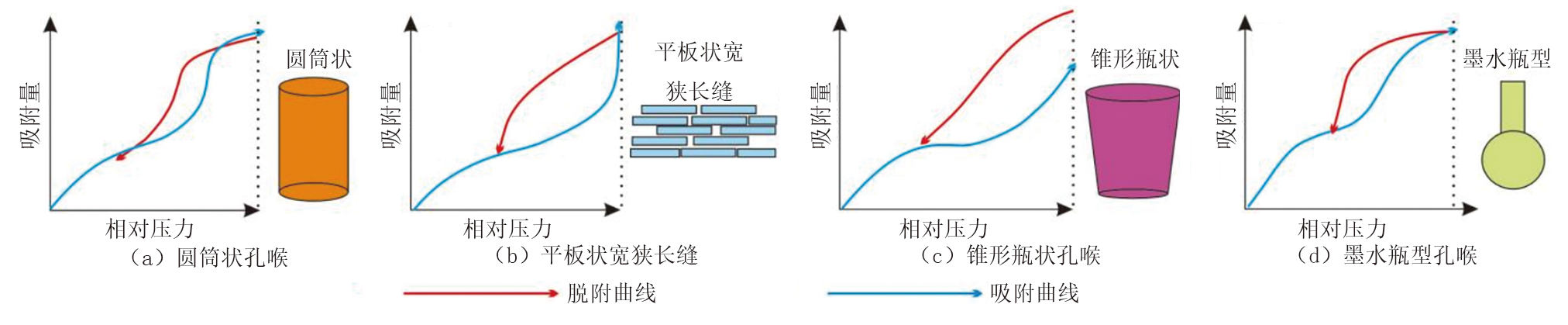 在气体吸附实验方面, 基于N2、CO2的气体吸附实验研究已很多[13, 14], 且根据吸附和脱附曲线的形状对孔喉进行了分类, 即圆筒状孔喉(图6a)、平板状宽狭长缝(图6b)、锥形瓶状孔喉(图6c)及墨水瓶型孔喉(图6d)。选取研究区Y 24x井流二段4块岩心样品分别进行N2、CO2吸附实验, 获得的气体吸附实验曲线及孔径分布曲线分别如图7、图8所示。