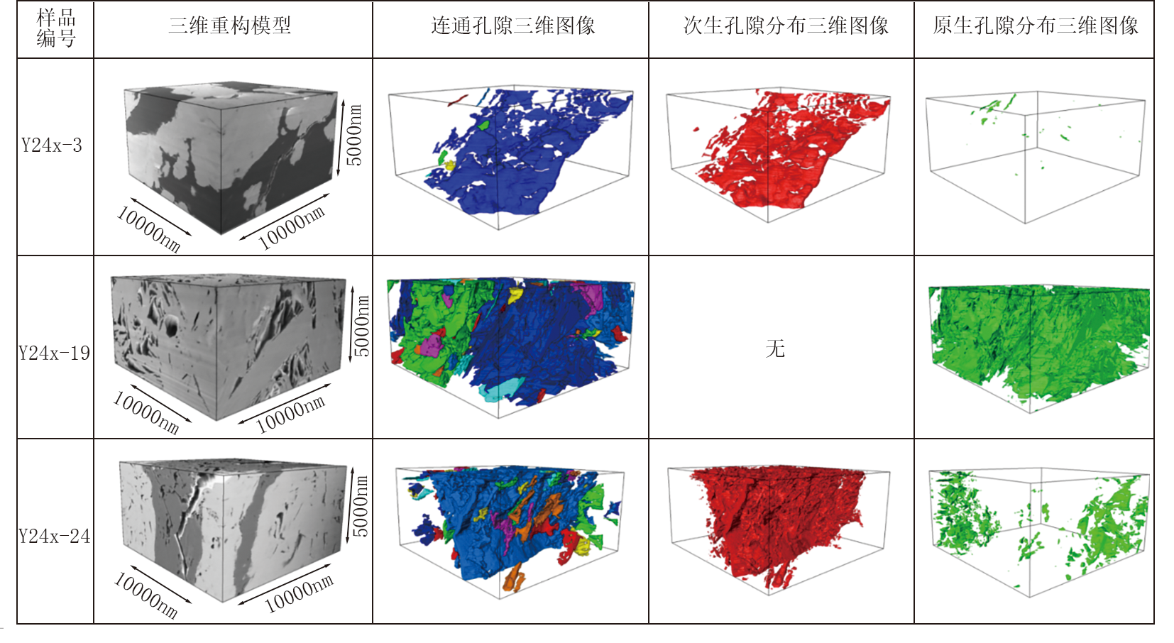 FIB-SEM可用于研究纳米级孔隙结构, 识别孔隙的三维空间展布特征, 该技术主要是使用镓离子束对样品进行连续切割, 同时在电子束下成像, 经过对齐剪裁、去窗帘效应等图像处理, 获得了相应的三维空间模型。该模型不仅具有较高的分辨率, 还避免了制样过程中的人造孔隙影响, 可更加真实地展现孔隙三维结构特征。本次实验中用于FIB-SEM三维重构分析的3块样品尺寸均为10 000 nm× 10 000 nm× 5 000 nm(表3), 其中蓝色代表有机质含量分布, 红色代表次生孔隙分布, 绿色代表原生孔隙分布, 其他颜色为矿物含量。Y 24x-3号样岩性为含砾细砂岩, 有机质含量为56.35%, 矿物含量约为26.77%, 次生孔和原生孔均有发育, 以次生孔为主, 次生孔占比为16.4%, 孔径介于21.22~5 136.48 nm之间, 平均值85.85 nm; 原生孔占比为0.49%, 孔径介于12.41~709.80 nm之间, 平均值53.01 nm。Y 24x-19号样岩性为砂砾岩, 有机质几乎不发育, 矿物含量高达83.33%, 只发育原生孔, 未见次生孔, 原生孔占比为16.67%, 孔径介于19.70~3 912.71 nm之间, 平均值79.31 nm。Y 24x-24号样岩性为含砾细砂岩, 有机质含量为57.00%, 矿物含量为41.99%, 原生孔和次生孔均有发育, 以次生孔为主, 次生孔占比为0.99%, 孔径介于12.41~2 093.03 nm之间, 平均值78.5 nm; 原生孔占比为0.02%, 孔径介于12.41~445.23 nm之间, 平均值50.43 nm。