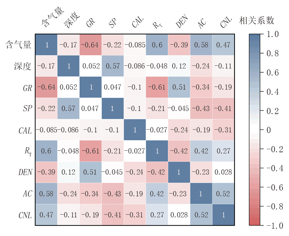 计算结果以相关系数热力图形式呈现(图1)。从图中可以直观地观察到深度、自然电位(SP)及井径(CAL)与含气量的皮尔逊相关系数绝对值均小于0.25, 统计意义不显著而未纳入后续建模; 最终优选出自然伽马(GR)、电阻率(RT)、密度(DEN)、声波时差(AC)及中子(CNL)这5个与含气量显著相关的敏感参数作为预测模型的特征变量。其响应机理可概括为:GR因矿物杂质吸附增强放射性并占据孔隙, 导致吸附能力下降, 故与含气量呈负相关[16]; DEN因吸附气引发基质膨胀, 导致岩石密度降低, 故与含气量呈负相关; AC因含气量增加削弱骨架弹性模量, 导致声速下降与时差增大, 故与含气量呈正相关; CNL则因有机质与束缚水的高含氢量随含气量增加而提升, 故与含气量呈正相关[17]; 而RT受多重变量控制[18], 在本研究区与含气量呈正相关。