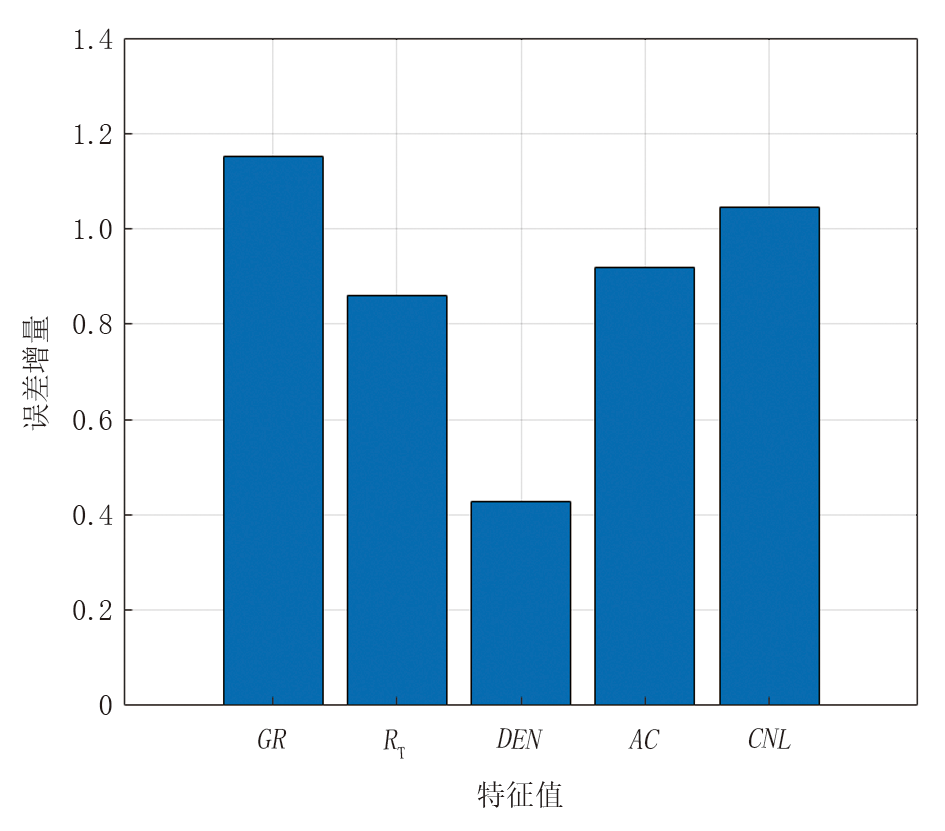 一是特征重要性评估。通过量化并评估各输入特征对于预测目标的重要性, 为模型提供可解释性。基于随机森林的袋外误差可评估特征重要性, 其核心机制为:对某一特征的值进行随机置换, 并计算由此导致的模型预测误差平均上升幅度, 误差增量越大, 说明模型越依赖该特征做出正确预测。从图2中可以看出, GR和CNL对含气量预测的贡献最大, RT和AC次之, DEN相对较低。