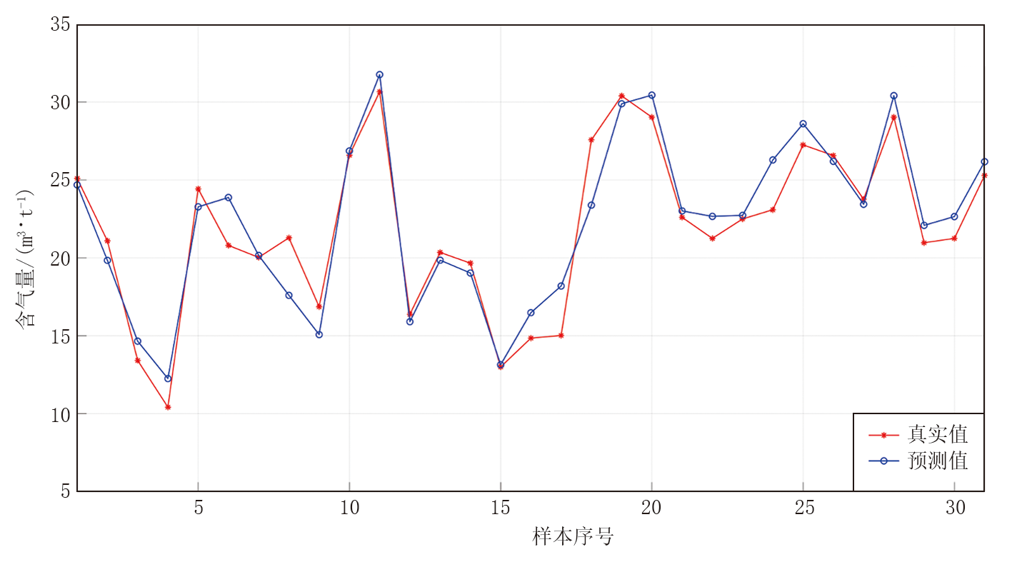 在训练集上, R2=0.911, RMSE=1.619, MAE=1.270; 在测试集上, R2=0.894, RMSE=1.698, MAE=1.313。这一结果在煤层含气量预测领域属于较高精度水平。如图3和图4所示, 该模型在训练集与测试集上均表现出良好的预测性能。训练集的预测值与真实值的变化趋势高度一致, 大部分样本的预测误差控制在较小范围内, 特别是含气量在15~30 m³ /t的中等区间预测精度最高; 测试集的预测精度虽然略低于训练集, 但整体上仍保持了较好的预测能力, 在极端值区域(如含气量< 15 m³ /t), 预测误差相对较大, 这与训练样本在这些区间的数量较少有关。