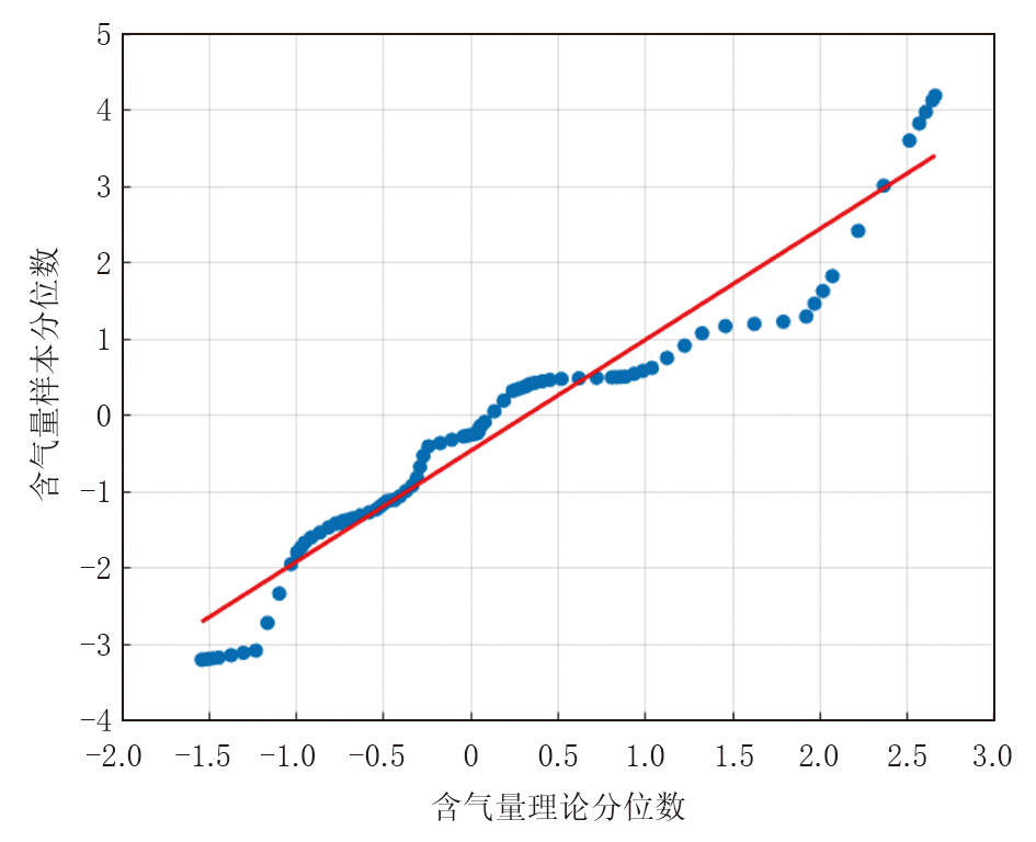 Q-Q测试误差图(图5)显示, 大部分数据点紧密地分布在中央的对角参考线周围, 尤其是中间部分(介于-1到1个标准差之间)。两端的点虽有轻微偏离, 但整体趋势与对角线高度重合, 未出现系统性的弯曲, 误差分布接近正态, 表明模型的预测误差是随机的、无偏的, 不存在系统性的高估或低估缺陷。
