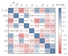 地球物理测井技术以其纵向分辨率高、连续性强且经济高效的优势, 成为预测煤层含气量重要且有效的技术途径。为表征煤层含气量与深度及测井参数之间的内在关联特征, 本文收集了研究区8#深部煤层125块样品的含气量测试数据, 在完成岩性归位处理后, 提取对应层段的常规测井曲线响应数值, 利用皮尔逊相关系数厘清煤层含气量与深度及各常规测井响应参数之间的关联性[14, 15], 其数学表达式为: