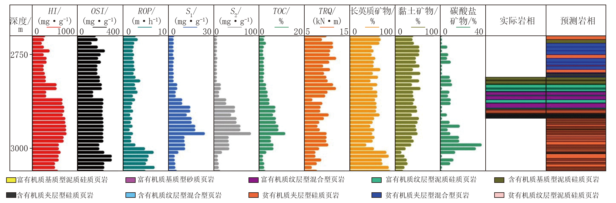 本文以X 6井为实例, 选取10种特征指标, 应用所建立的页岩岩相预测方法对该井2 700~3 050 m井段的页岩岩相进行随钻录井识别, 并与2 818~2 922 m井段的实际岩相数据展开对比分析。如图10所示, 预测岩相剖面与实际岩相剖面在2 818~2 922 m井段内高度一致, 10种岩相类型均被准确识别, 符合率达到了100%, 充分表明本文所建立的预测方法具备较强的稳定性与泛化能力, 在压裂选层优化与储层改造工程实施中, 核心优选岩相应聚焦于富有机质纹层型混合型页岩、富有机质纹层型泥质硅质页岩、含有机质夹层型硅质页岩、含有机质纹层型混合型页岩, 以保障作业针对性与储层改造效率。