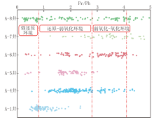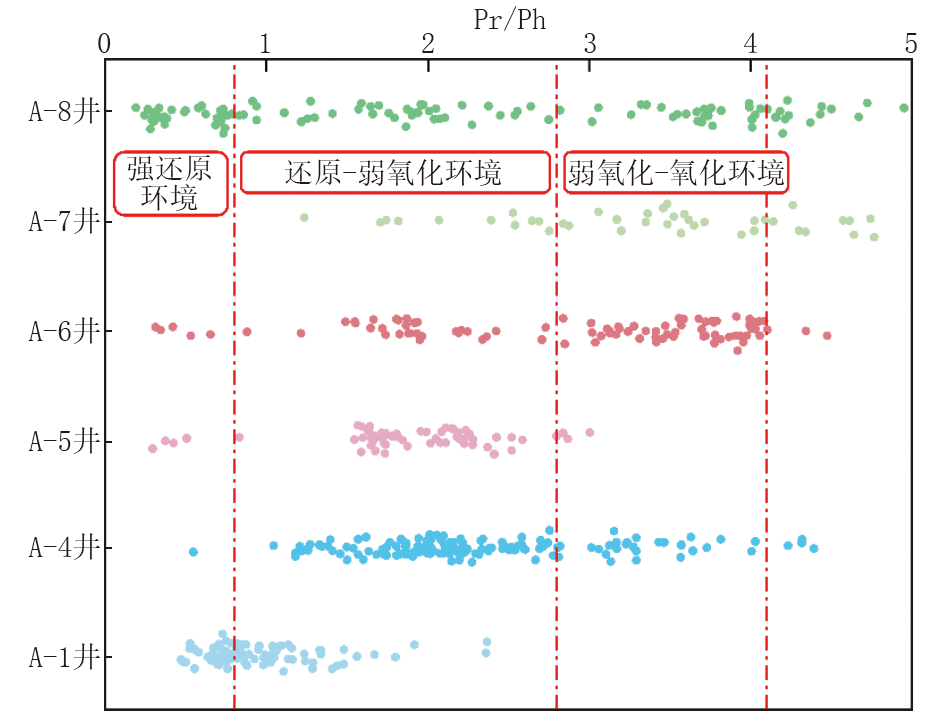 梅博文等[24]研究表明, 沉积环境对烃源岩和原油的Pr/Ph(姥鲛烷/植烷)比值具有显著影响。盐湖和咸水湖相沉积体系通常显示植烷优势, 其Pr/Ph比值普遍小于0.8, 呈现强还原环境; 淡水-半咸水湖相沉积的Pr/Ph比值多分布在0.8~2.8之间, 反映还原-弱氧化环境; 而淡水湖相沉积的Pr/Ph比值通常高于2.8, 最高可达4.0以上, 表征弱氧化-氧化环境。研究区油页岩Pr/Ph比值多介于0.8~4.1之间, 主要分布于淡水-半咸水湖相范围, 以偏淡水和淡水-微咸水环境为主(图2)。