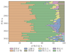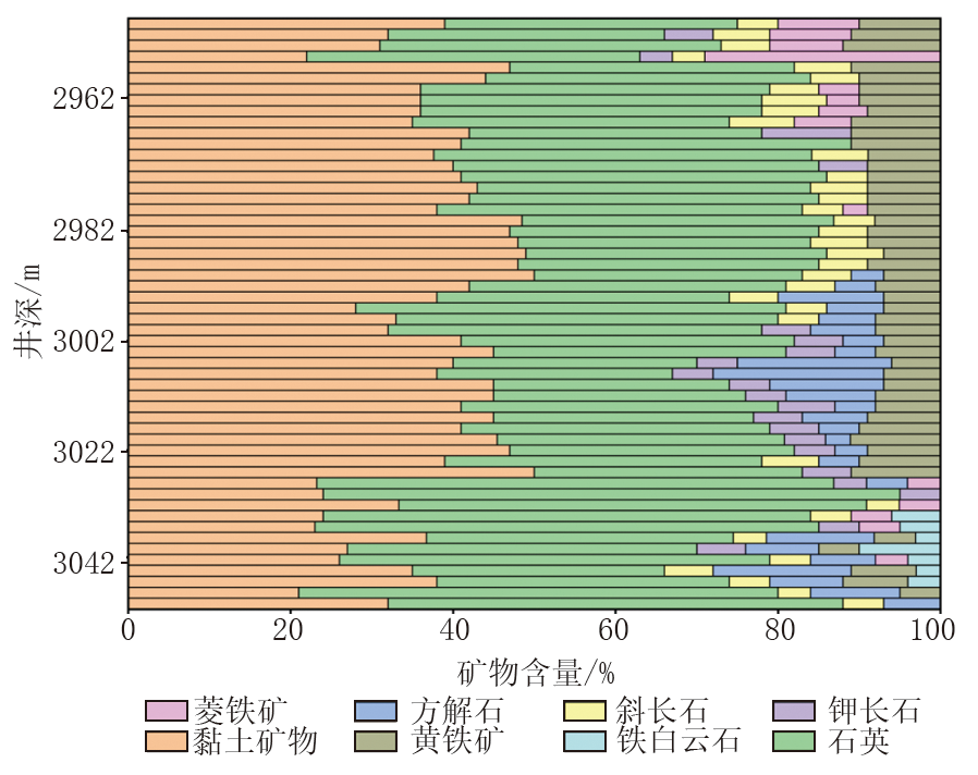 对研究区页岩样品开展了XRD分析。如图3所示, 工区细粒沉积岩的矿物组成主要包含石英、钾长石、斜长石、方解石、铁白云石、菱铁矿、黏土矿物、黄铁矿等。通过分析可得, 石英含量高达29%~75%, 其平均含量为40.8%; 黏土矿物次之, 含量为20%~51%, 平均含量为37.3%; 其他矿物的平均含量均小于10%。