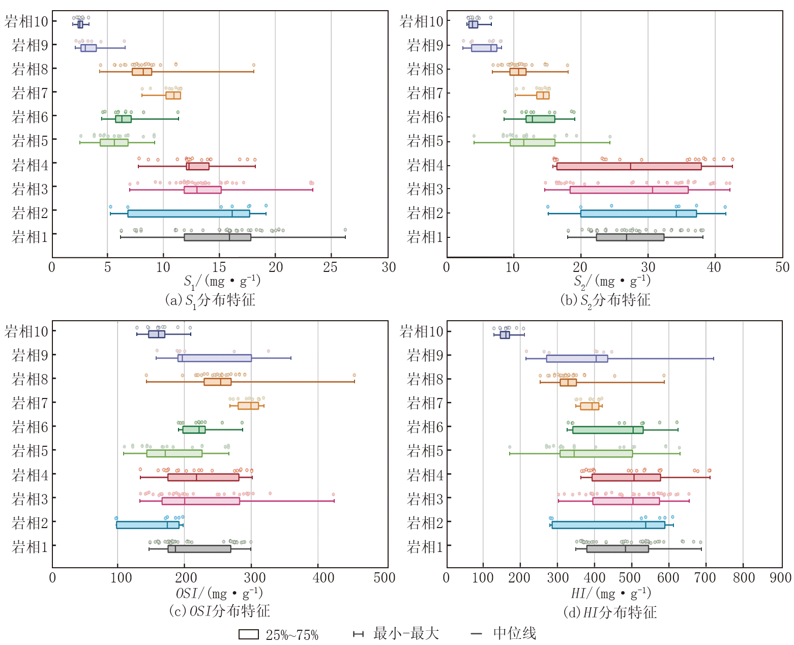 统计不同岩相的游离烃(S1)、热解烃(S2)、含油饱和度(OSI)等岩石热解录井数据, 开展不同岩相下岩石热解特征差异性分析, 如图5所示。分析结果表明:基质型岩相(序号1、2、5)和纹层型岩相(序号3、4、7、10)的S1(均值8.57 mg/g)、S2(均值30.71 mg/g)较高, 其油气显示和生烃潜量较好, 夹层型岩相(序号6、8、9)则相对较低; 夹层型岩相的OSI(均值289.78 mg/g)相对较高, 其页岩油的流动性相对较好, 纹层型岩相次之, 基质型岩相页岩油流动性适中; 氢指数(HI)分析显示, 基质型岩相页岩HI值普遍高于500 mg/g, 表明其以Ⅰ 型干酪根为主, 具备更强的液态烃生成潜力, 而夹层型岩相HI值较低(约400 mg/g), 反映其有机质类型向Ⅱ 型过渡。