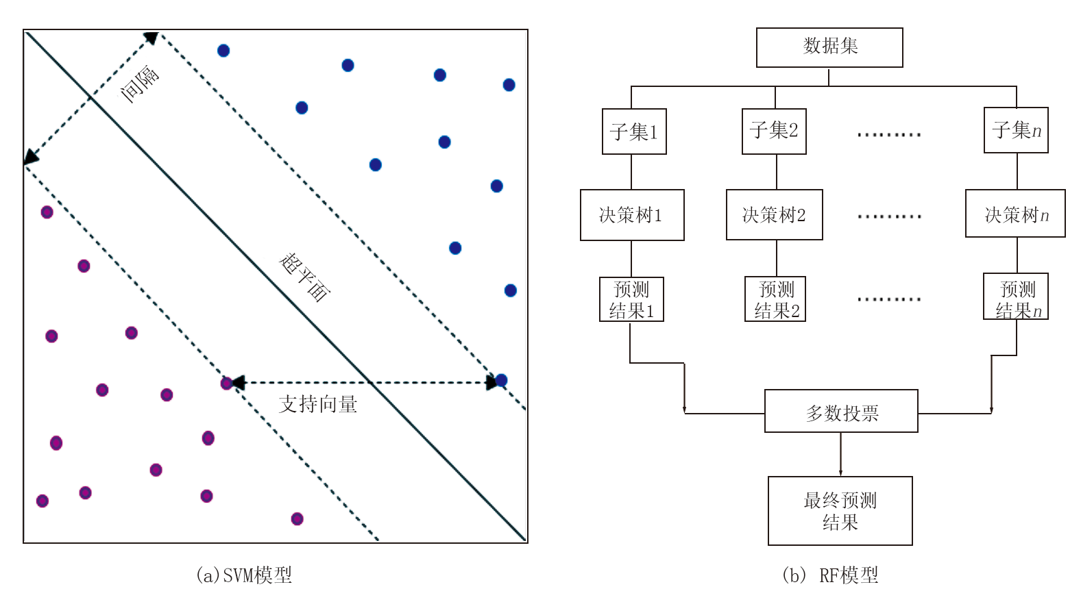 SVM算法依托于统计学习理论框架, 遵循结构风险最小化原则, 其核心是在样本空间或特征空间中构建最优拟合超平面实现样本判别[29]。如图7a所示, 特征图空间中存在多个可能的分类超平面, 但仅有一个最优解(图7a中实线)。最优超平面与非最优平面间的最大距离(即间隔)可有效评估决策边界在训练集上的泛化误差[30]。SVM具有分类能力强大及数据稀疏性等优点, 凭借出色的分类性能与数据稀疏处理能力, 已成为机器学习领域的重要方法, 被广泛应用于地球科学领域, 如地质体智能识别[31]、地质预测系统开发[32]。