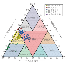 利用矿物组分分类三角图对测试样品进行类型划分。如图4所示, 将所有样品的数据点投在矿物组分分类三角图上, 以确定不同矿物的分类特征。根据长英质矿物、黏土矿物和碳酸盐矿物的相对含量, 将研究区页岩岩相划分为4类:硅质页岩、泥质硅质页岩、混合型页岩、砂质页岩。