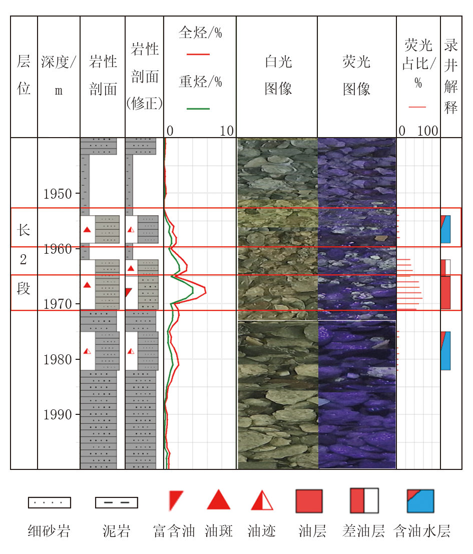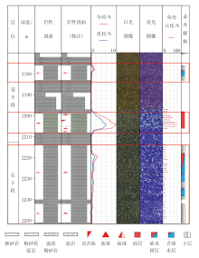长3段(2 214.00~2 251.00 m), 该层段荧光响应较强, 图像中黄绿色荧光广泛分布。计算该段荧光占比在5.12%~23.32%区间范围内, 符合“ 油斑” 级别的标准。现场初步定级为“ 油迹” , 经过对图像数据的深入分析后, 这一评级被修正为更准确的“ 油斑” 级别。在井段2 219.00~2 228.00 m处, 气测录井数据显示出显著的异常特征, 结合较高的荧光占比, 表明此区域储层具有良好的含油性, 但纵向对比分析显示, 储层表现出较强的非均质性。综合这些信息, 对该层段进行解释的结果是油水同层, 这指示该层存在油水共存的现象, 显示出其具有一定的开发潜力与价值, 并建议进行测试。