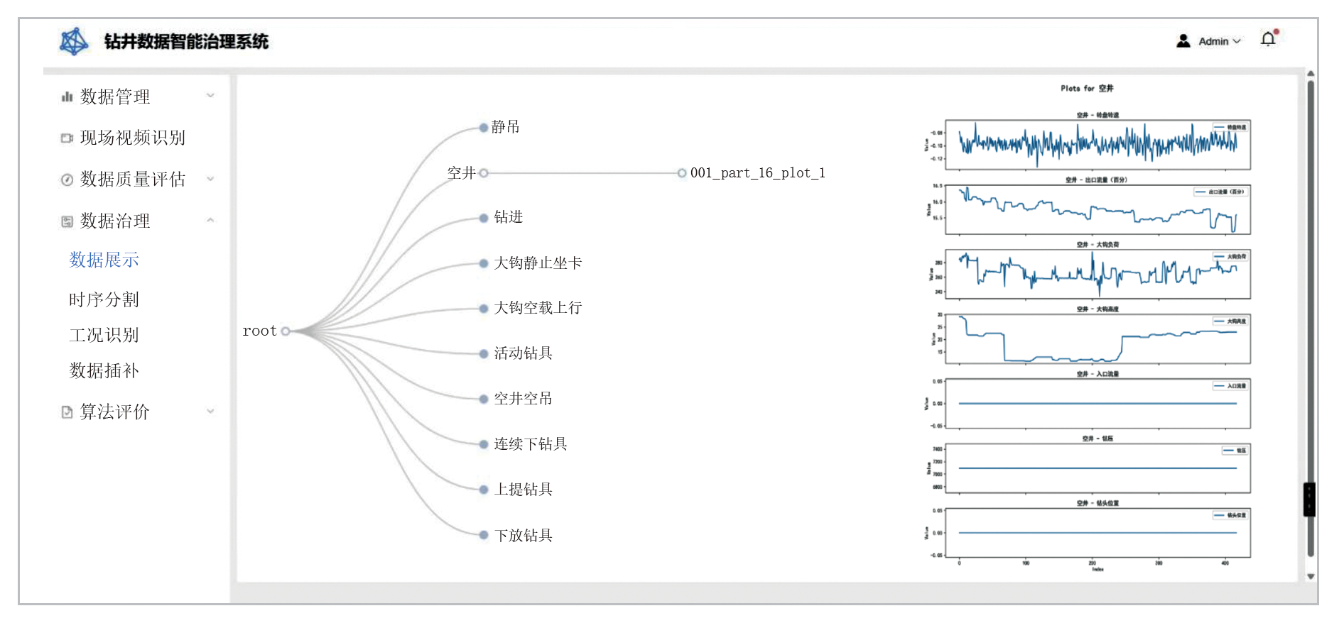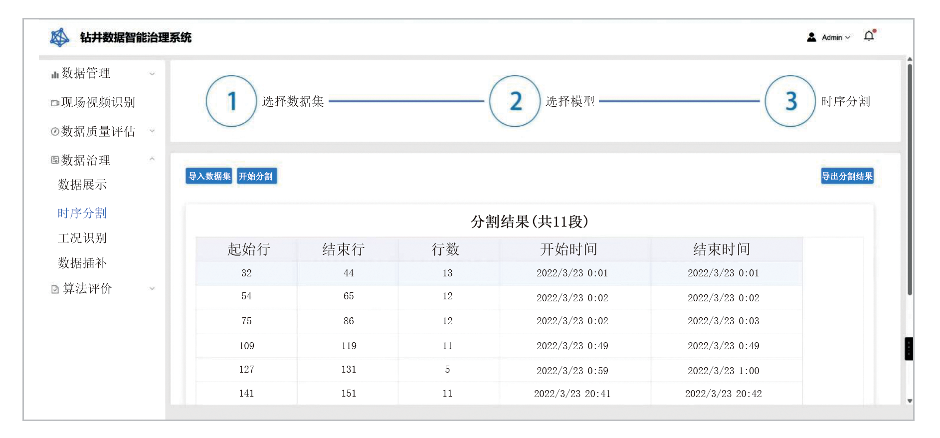 该模块对数据进行展示, 用户可直观浏览数据, 根据导入的数据集进行时序分割并将分段结果清晰呈现, 进而对其工况进行智能识别, 再完成数据的修正与插补。可视化界面如图6、图7所示。