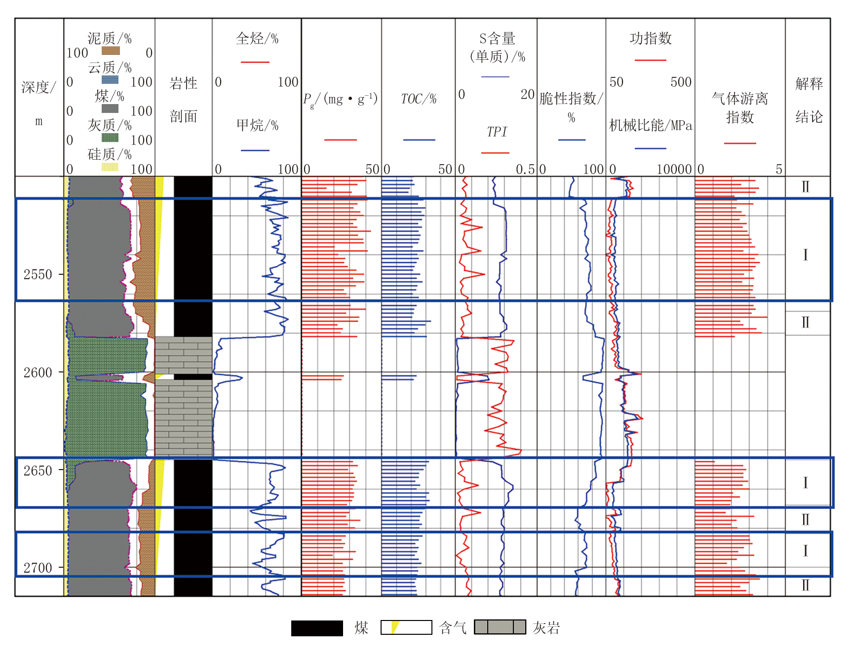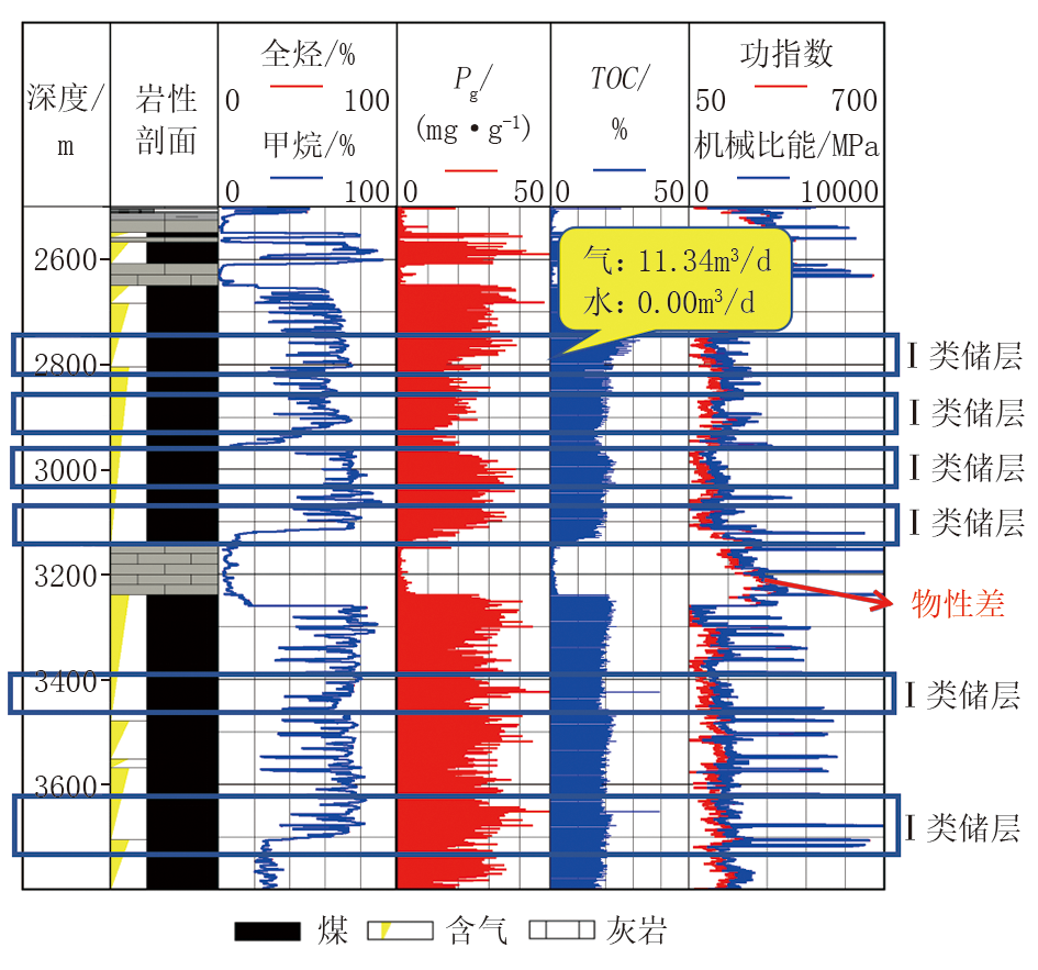 以S 8X井煤岩气储层为例, 说明如何应用甜点评价标准对煤岩气进行解释评价。S 8X井钻探目的为探索以深层煤为主的煤灰组合煤岩气成藏模式, 探索本溪组8#煤层勘探开发技术, 求取大斜度井产能, 实现盆地中东部接替领域战略突破。本溪组8#煤层为该大斜度井实施的主要目的层, 录井井段为65.00~2 715.00 m, 大斜度段长度200 m, 煤岩长160 m, 煤岩钻遇率80.00%, 录井采集资料齐全, 随钻录井综合图如图6所示, 煤岩段TOC均值为24.65%, 有机质丰度较好, 生烃潜力大。利用S含量与TPI曲线判断储层含气性, 明显看出本井共有3段储层油气富集, 显示含气性好, 对应的功指数、机械比能参数较小, 脆性指数变大, 进一步分析储集空间较好, 可压裂性好, 气体游离指数均值为2.63(大于界限值1), 显示储层以游离气为主, 综合解释为Ⅰ 类储层。其他非标注段, 对应油气富集程度稍差, 但仍以游离气为主, 结合储集性划分为Ⅱ 类储层。统计分析本井大斜度段共计解释Ⅰ 类储层3层/98.00 m, Ⅱ 类储层4层/62.00 m。根据录井解释进行甜点综合分析及有利射孔井段的优选, 后期求产测试产气3.6× 104 m3/d, 排采计量91 d, 累产气208.58× 104 m3, 返排率52.70%, 录井技术准确地指示了储层流体性质, 解释标准更加可靠。