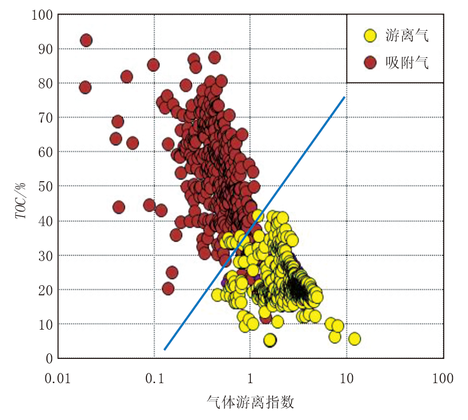 深层煤岩气储层气体赋存表征更复杂, 吸附气与游离气共存, 关注吸附态和游离态的比例变化, 确定储层渗流能力是提高产量的关键。煤岩气的吸附能力与有机质含量存在显著正相关关系, 但TOC过高的煤岩将降低游离烃的比例, 使得储层渗流能力降低, 加大煤岩气的开采难度。笔者利用气测数据派生参数结合TOC, 建立了煤岩气气体游离指数评价图板(图5), 该指数直接反映了储层有机质丰度及游离烃的关系, 气体游离指数> 1, 储层以游离气为主, 能够更好地指示煤岩气储集空间气体的赋存状态。