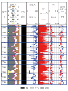 含气性评价是煤岩气勘探的核心环节, 但研究和经验表明[12, 13], 仅依赖全烃值、S1或Pg值等单一参数时, 含气性规律难以明确表征。为此, 提出采用派生参数总产率指数(TPI=(S0+S1)/Pg)与TOC或S元素含量的交会分析法, TPI越小, TOC与S元素含量越大, 储层的含气性越好。其中TPI反映烃类生成效率, 数值降低指示生烃潜力释放, TOC或S元素含量的增加则表征有机质富集程度增加。通过每两个参数的协同响应关系, 可有效识别煤岩气富集区:二者交会面积越大, 储层含气性与资源丰度越高。从含气性动态表征模型随钻录井图(图4)来看, S元素含量与TPI交会趋势更明显, 图中蓝色标注框内的油气富集明显, 划分为Ⅰ 类储层; 蓝色框外其他未标注区域气测异常也较为明显, Pg值没有明显变小趋势, 但综合分析含气性差, 划分为Ⅱ 、Ⅲ 类储层。
